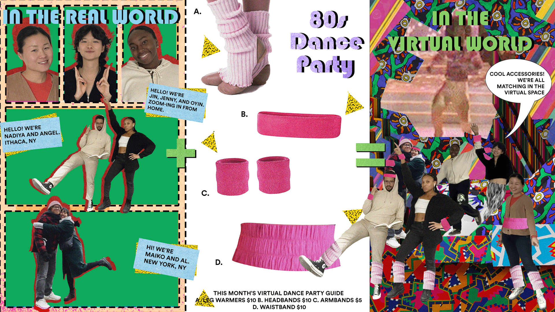 As a virtual dance party gathers people from all different locations in the real world in one space, how do we foster connections in a virtual world? Our solution: shared physical objects that can be brought into the virtual space that has function and unites. In the case of the 80s dance party: pink legwarmers, headbands, armbands, and waistbands that transform into accessories with changing patterns on the dance floor.